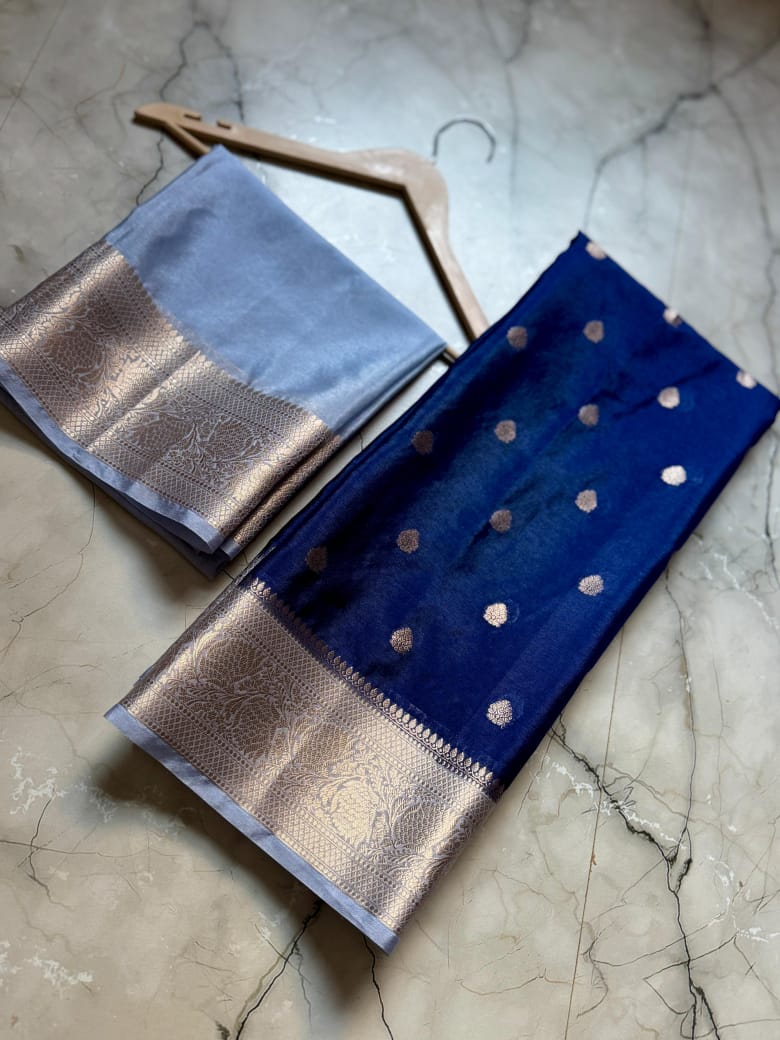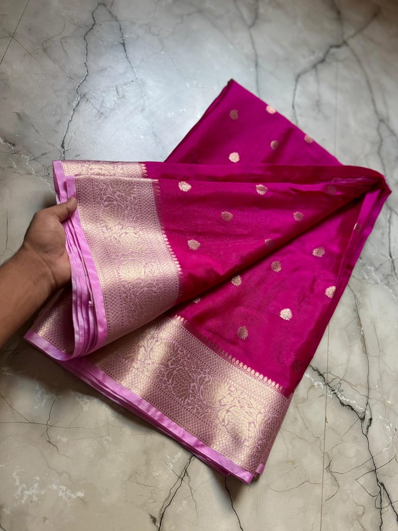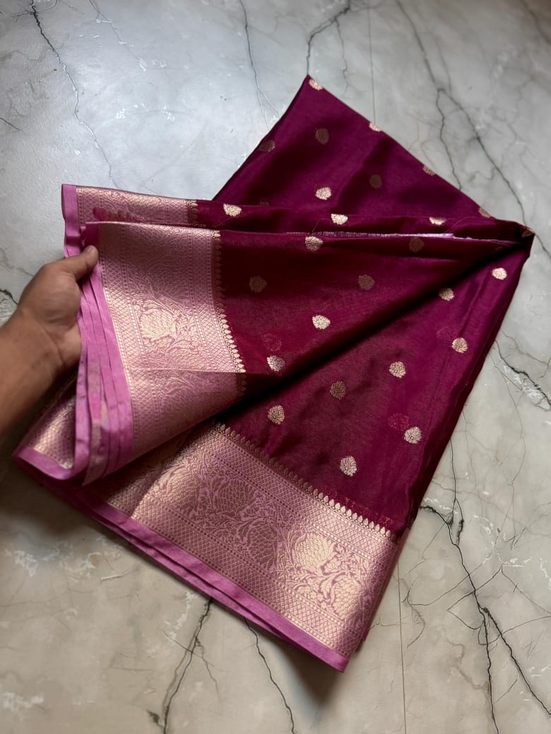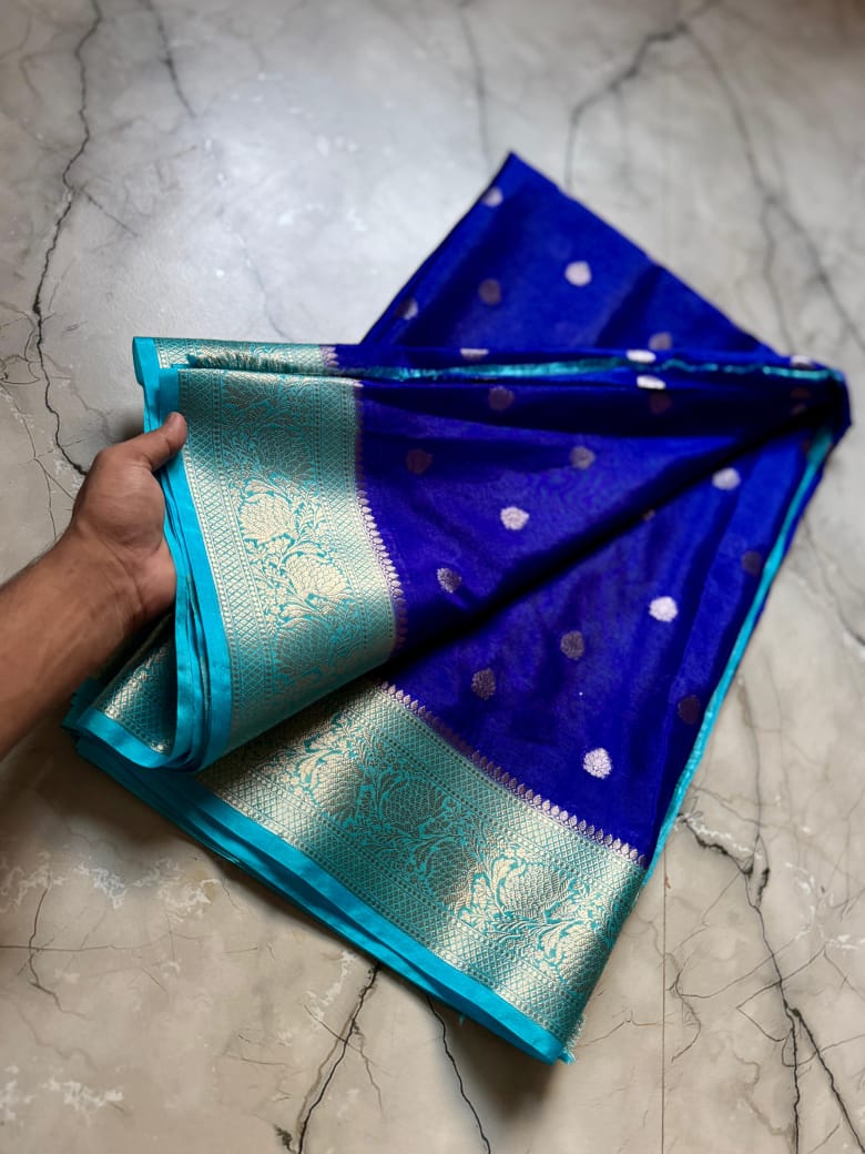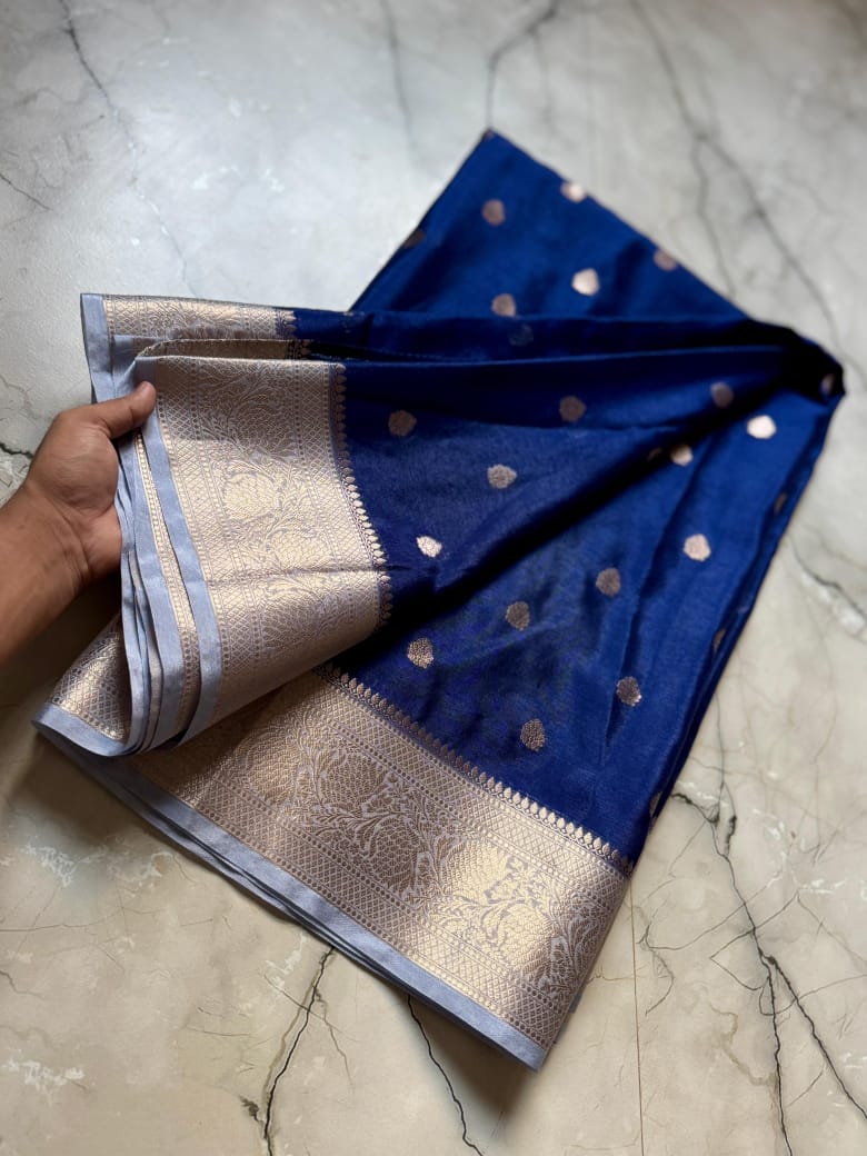 • Full Body Weaving: The entire length of the saree is adorned with meticulously woven Zari Buttis, adding a touch of royal shimmer to every fold.