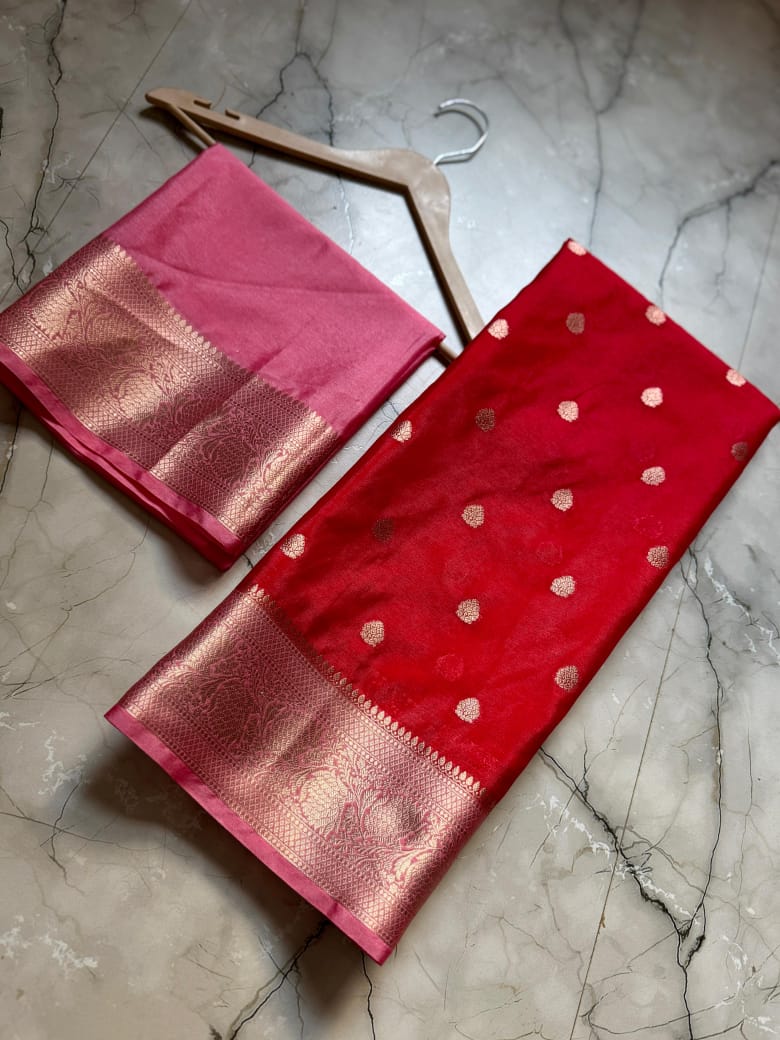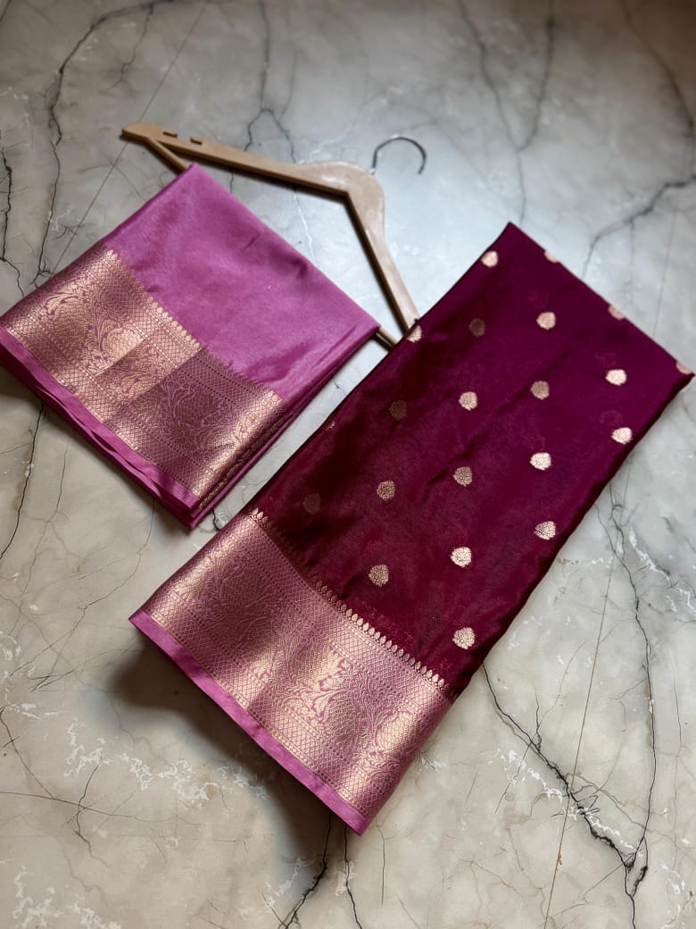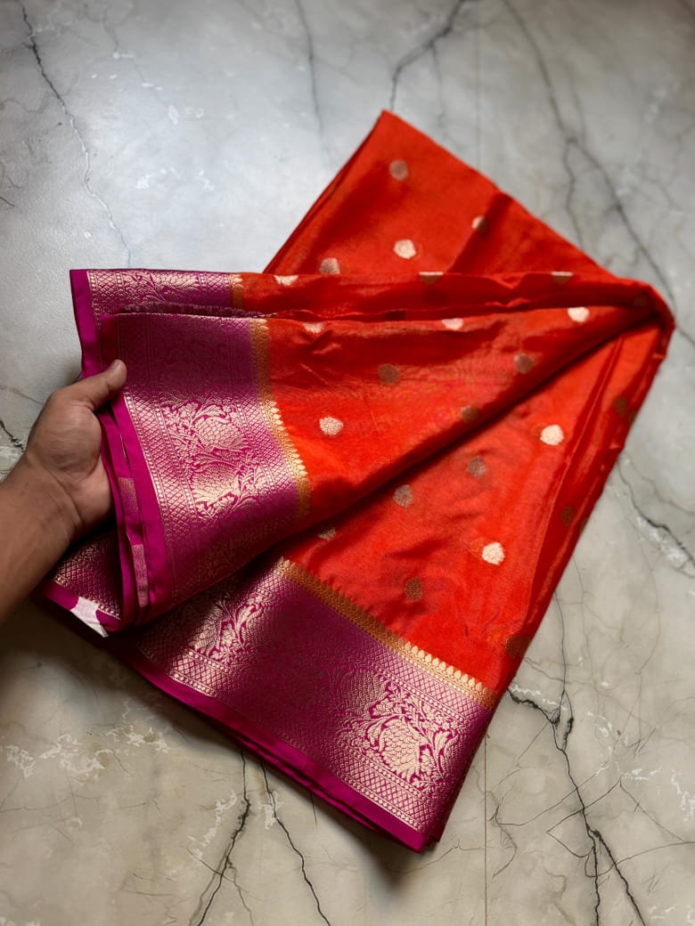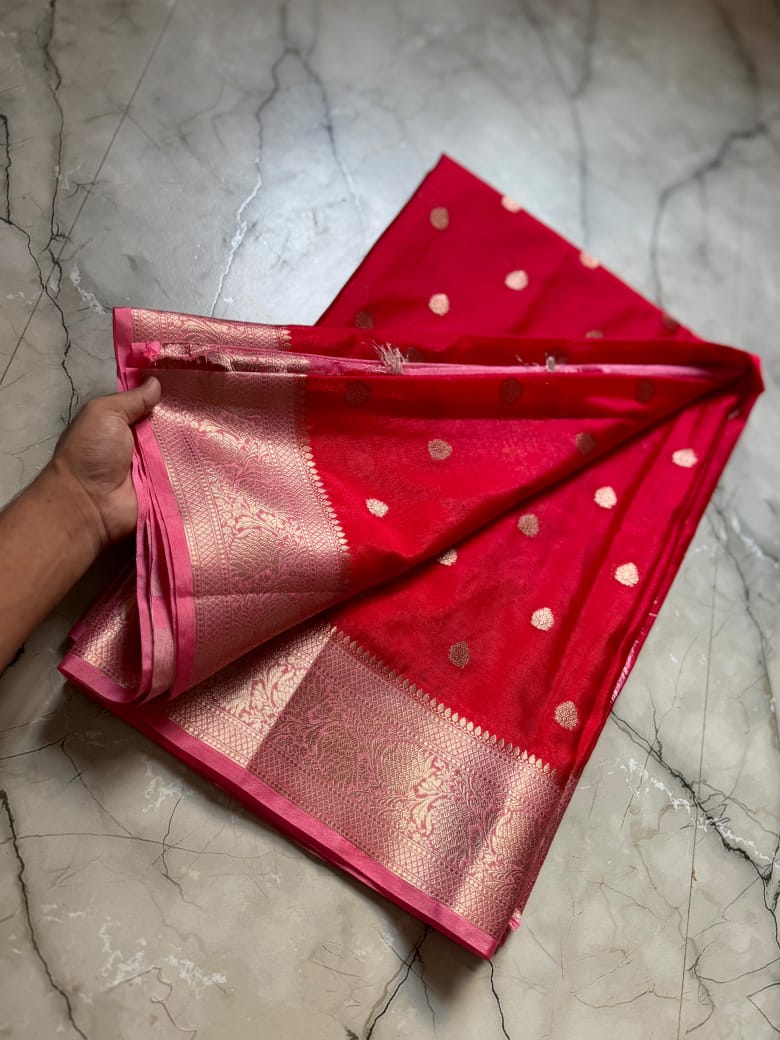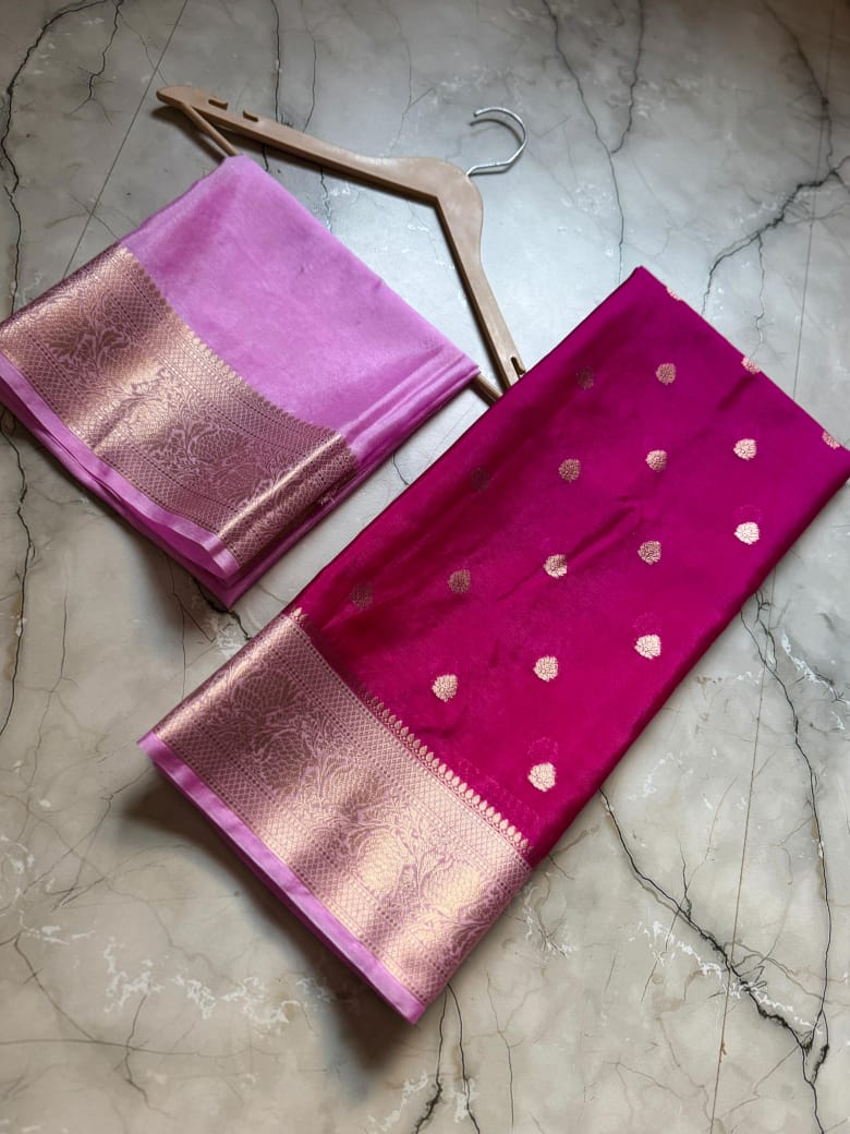• Full Body Weaving: The entire length of the saree is adorned with meticulously woven Zari Buttis, adding a touch of royal shimmer to every fold.